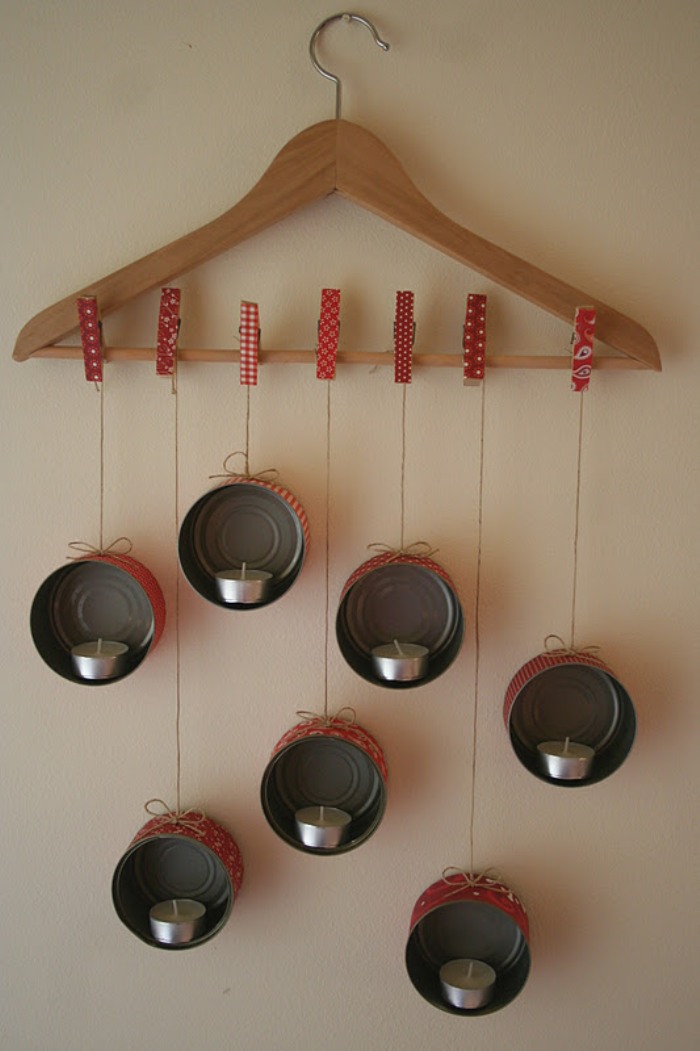 O trabalho fica por conta de tirar a tampa das latinhas, embalá-las com papel contact, tecido ou outros tipos de papéis que você queira reaproveitar, decorar os grampos, pendurar as latinhas e por fim colocar as velas.